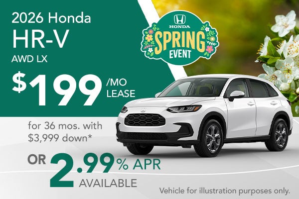 Offer excludes accessories and premium paint colors. Includes $750 Loyalty or Conquest Offer toward Cap Cost Reduction or Down Payment Assistance with lease or finance through Honda Financial Services. Closed-end lease for 2026 Honda HR-V LX AWD Variable Transmission available through 3/31/2026 to approved lessees or purchasers by Honda Financial Services. Includes destination; excludes first months payment, tax, title, license, registration, options, insurance, and $799 admin fee. Monthly payment/total due at lease signing includes $500 Loyalty or Conquest Offer toward Cap Cost Reduction or Down Payment Assistance. Available to current owners of any 2011 or newer Honda, Chevrolet, Ford, Hyundai, Jeep, Kia, Mazda, Nissan, Subaru, Tesla, Toyota and Volkswagen vehicles. Must provide proof of ownership of eligible vehicle in the form of a current vehicle registration or proof of valid auto insurance. No trade-in required. Lessee is responsible for maintenance, excessive wear/tear, and up to $0.20/mi. over 10,000 miles/year. Dealer participation may affect actual payment. Dealer sets actual prices. See dealers for details. APR: Available on approved credit through Honda Financial Services in select states only. 2.99% APR for up to 48 months on select new and unregistered 2026 Honda HR-V models through 3/31/2026, for well-qualified buyers. Not all buyers will qualify. Higher financing rates apply for buyers with lower credit ratings. Actual down payment may vary. Dealer participation may affect actual payment. Dealer sets actual prices. See participating dealers for details.