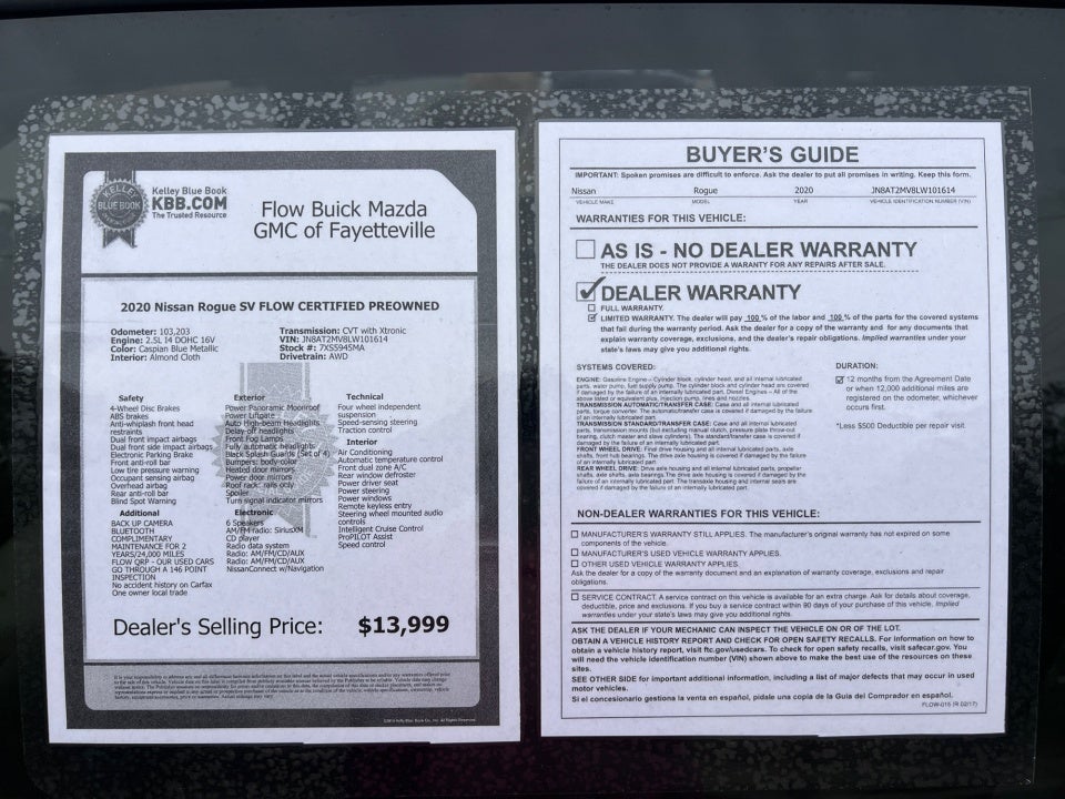 Flow Buick Mazda GMC of Fayetteville is pleased to offer this charming-looking 2020 Nissan Rogue Caspian Blue Metallic SV with the following features: FLOW CERTIFIED 12 MONTHS/12000 MILE POWERTRAIN WARRANTY 3 day money back guarantee and a free maintenance package! ** BACK UP CAMERA Bluetooth® COMPLIMENTARY MAINTENANCE FOR 2 YEARS/24 000 MILES FLOW QRP - OUR USED CARS GO THROUGH A 146 POINT INSPECTION No accident history on Carfax One owner local trade Rogue SV FLOW CERTIFIED PREOWNED 4D Sport Utility 2.5L I4 DOHC 16V AWD Caspian Blue Metallic Almond Cloth 18" Aluminum Alloy Wheels Electronic Parking Brake Heated Leather-Wrapped Steering Wheel Intelligent Aroundview Monitor (I-AVM) Intelligent Cruise Control Memory Driver Seat & Outside Mirrors Power Panoramic Moonroof ProPILOT Assist Radio: AM/FM/CD/AUX NissanConnect w/Navigation Steering Assist Sun & Sound Touring Package.