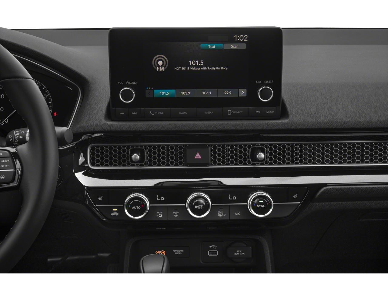 - Radio: 180-Watt Audio System -inc: 8 speakers, 7" touch-screen, Bluetooth® HandsFreeLink, Bluetooth® streaming audio, Radio Data System (RDS), speed-Sensitive Volume Compensation (SVC), 2.5-amp USB smartphone/audio interface port in front console, HondaLink, Apple CarPlay integration, Android Auto integration and SMS text message function